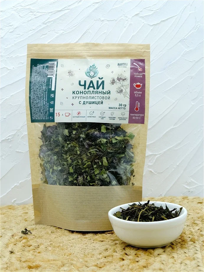 Конопляный чай «Алатау» с душицей - это высушенная измельченная смесь ферментированного листа растения Cannabis sativa, сорта «Родник» и листьев с соцветиями Origanum vulgare. Сорт конопли «Родник» включен в Госреестр РФ и содержит менее 0,1 % ТГК.