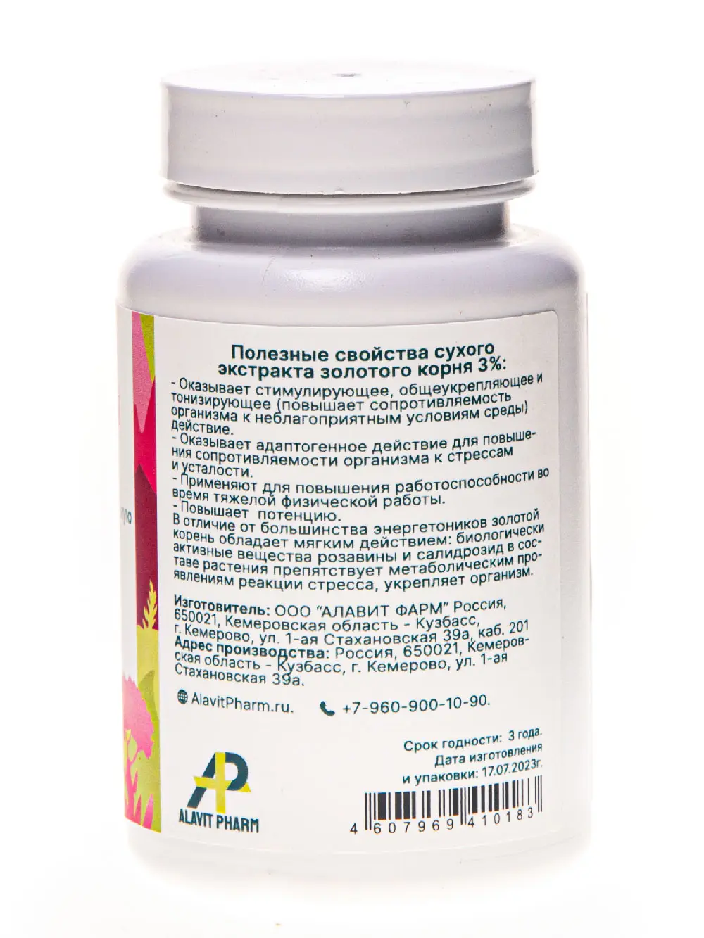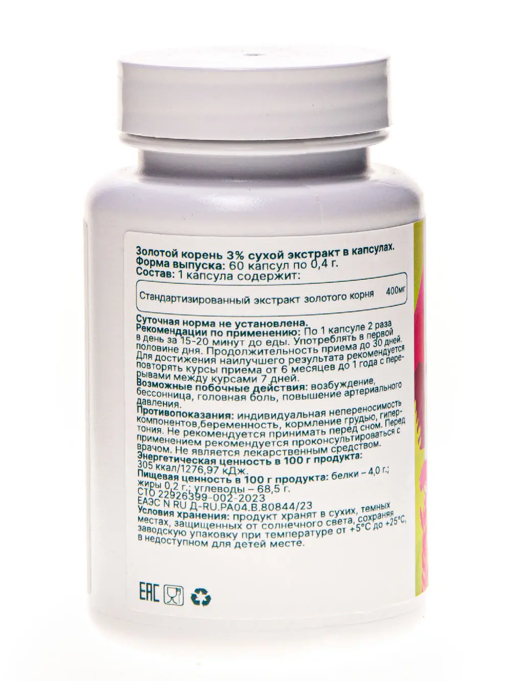 Содержание в одной капсуле: стандартизированный экстракт золотого корня, 300 мг, мальтодекстрин, 100 мг.