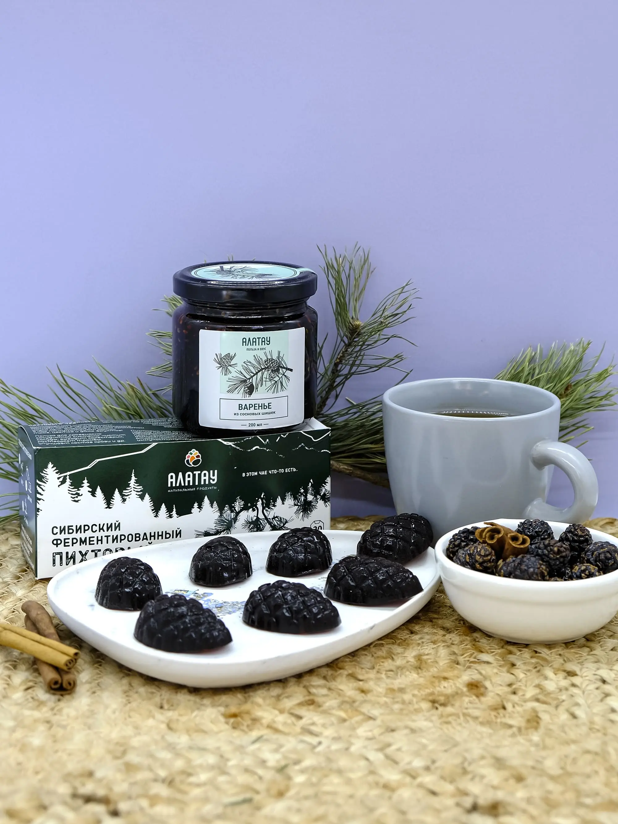 Состав мармелада «Байкал» – сахар, сосновый сироп, патока, пектин, лимонная кислота, растительное масло, пчелиный воск, корица, имбирь.