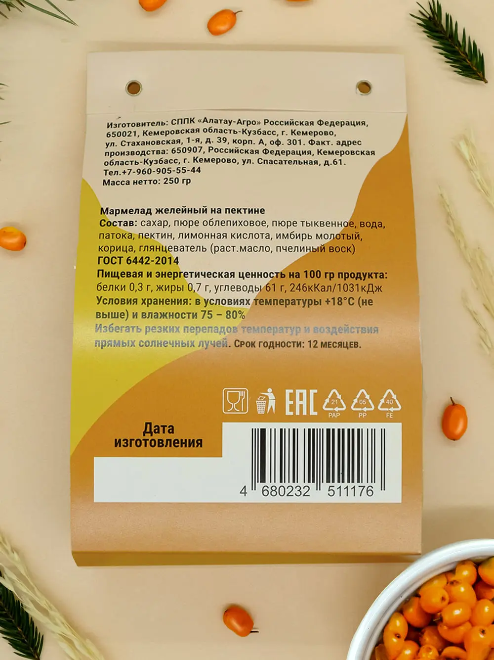 Состав мармелада богат на функциональные ингредиенты – пюре тыквы, сироп из облепихи, пряности имбирь и корица, пектин.