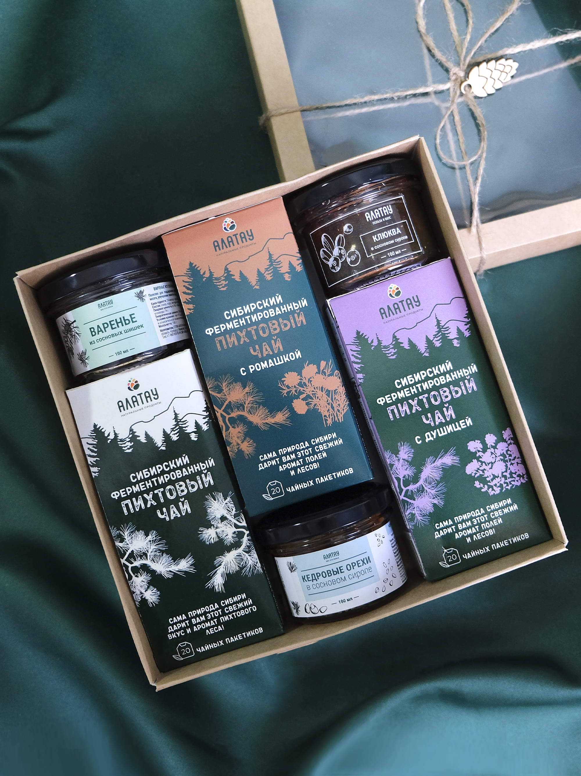 Пихтовый чай с ромашкой пакетированный; Пихтовый чай с душицей пакетированный; Пихтовый чай классический пакетированный; Варенье сосновое, 100 мл; Кедровые орехи в сосновом сиропе, 100 мл; Клюква в сосновом сиропе, 100 мл.